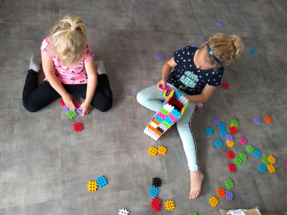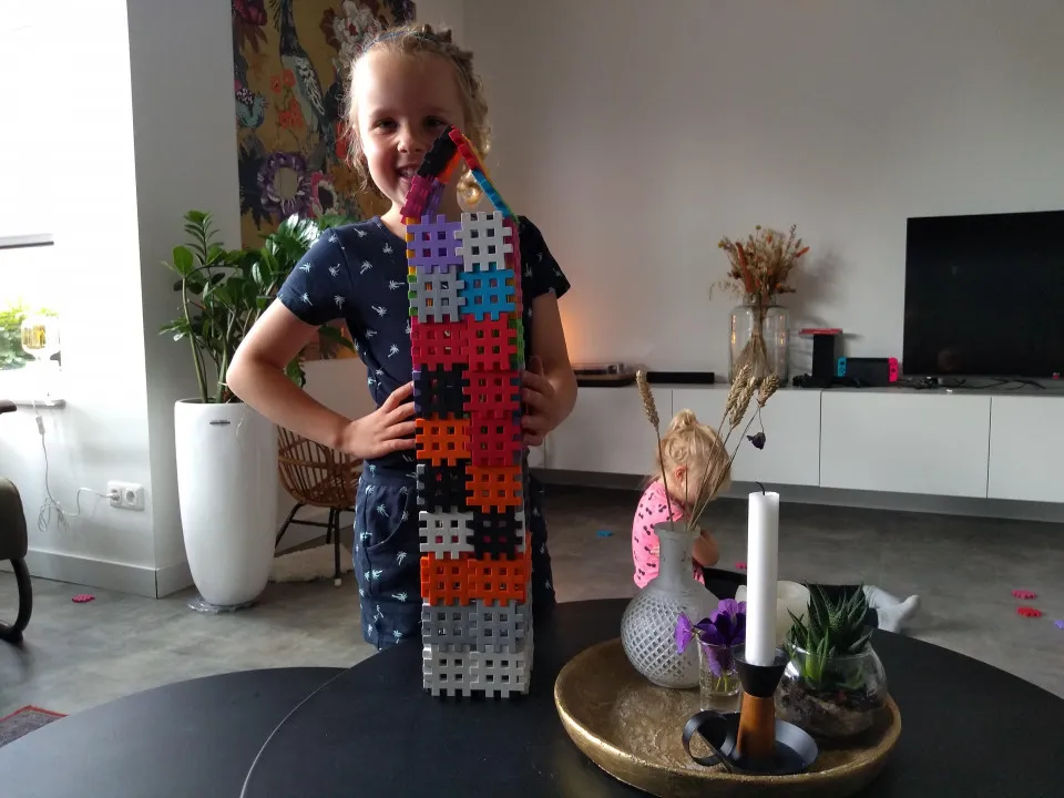 ¡Creemos que este juguete es una oportunidad! De hecho, todavía no teníamos ningún juguete de construcción en la casa y este es un juego muy bueno para empezar. Requiere paciencia, creatividad y estimula la imaginación de un niño y creo que ese es un aspecto importante cuando compro juguetes. No hay nada correcto o incorrecto en la construcción, simplemente lo desarma y comienza de nuevo. Los juguetes traen un poco de paz después de un día lleno de estímulos. Sin colores llamativos, luz o ruido y el material flexible se siente muy bien en la mano. Este juguete también se puede dejar en el suelo cuando nuestra hija menor gatea por la habitación. Esto a diferencia de, por ejemplo, Playmobil o LEGO. Tampoco desarma las estructuras rápidamente para alivio de los tres mayores. Tampoco hay problema si los niños pequeños se llevan los juguetes a la boca, estos bloques son lo suficientemente grandes y se pueden limpiar con agua y jabón.
