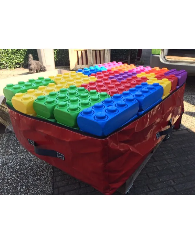 Las bolsas también son apilables y rectangulares, lo que facilita su almacenamiento. También son muy prácticas para las empresas de alquiler de material de juego. Las bolsas tienen el tamaño de un palé.