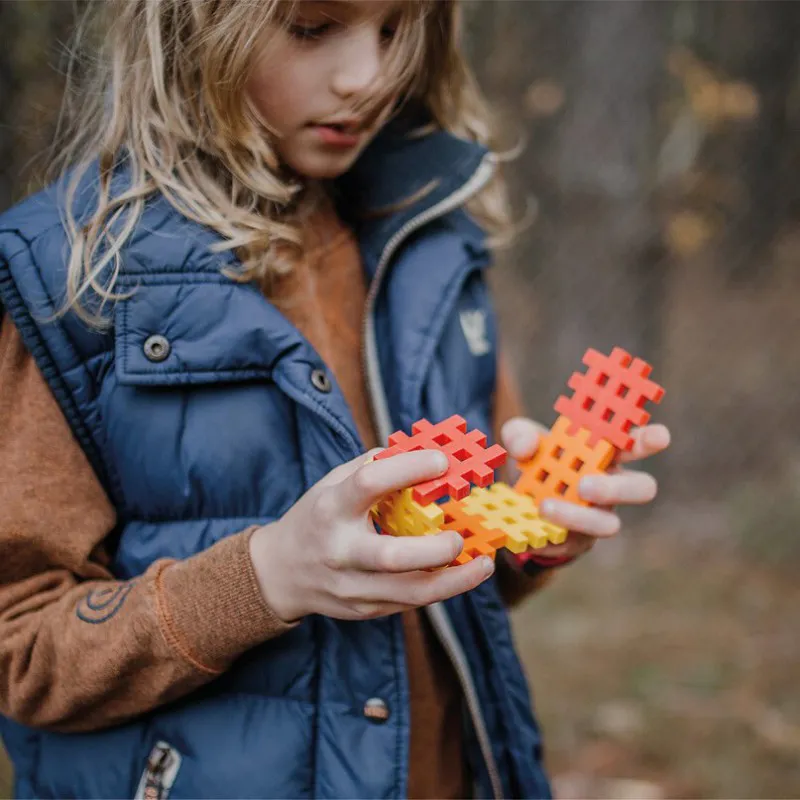 Los bloques de gofre Midi están hechos de plástico no tóxico y totalmente biodegradable. Se asemejan a la goma al tacto, ya que son flexibles y tienen los bordes lisos. Se incluye una guía para ayudar a los niños a iniciarse con ejemplos.