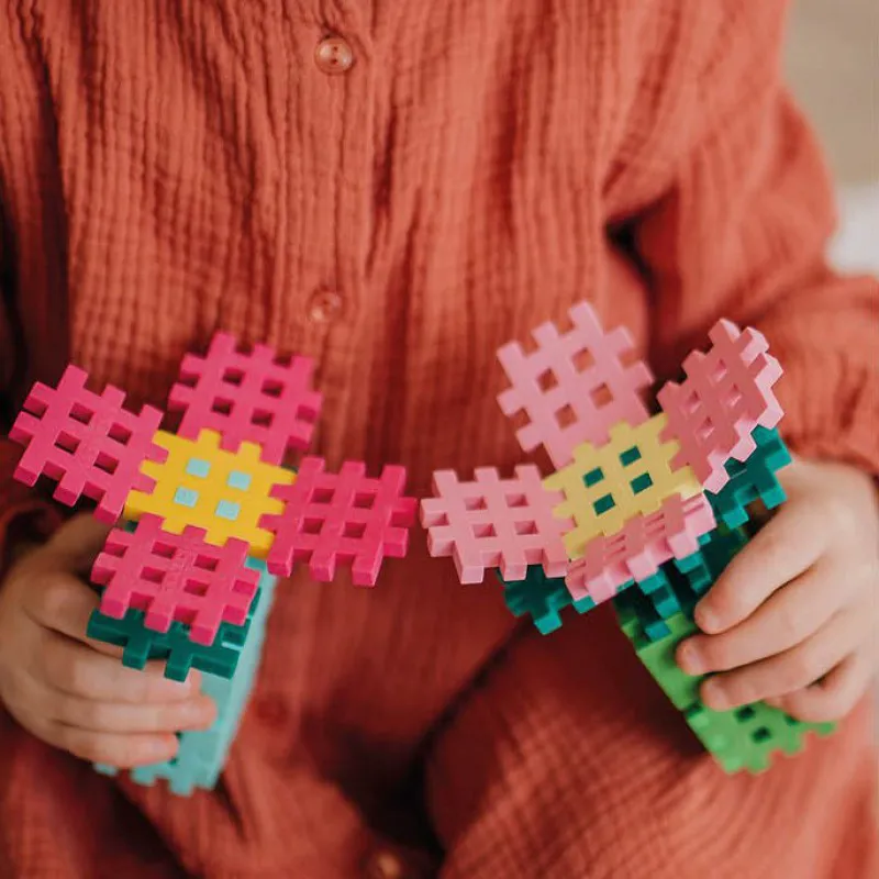 Los mini bloques de gofre están hechos de plástico no tóxico y totalmente biodegradable. Se asemejan a la goma al tacto, ya que son flexibles y tienen los bordes lisos. Se incluye una guía para ayudar a los niños a iniciarse con ejemplos.